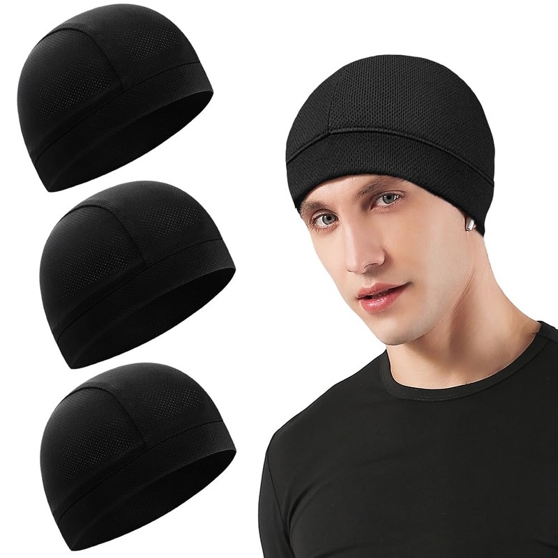 Inner Cap, Set of 3, Helmet, Beanie Cap, Mesh Construction, Breathable, Sweat Absorbent, Quick Drying, Cool to Touch, Stretch, Biking, Cycling, Road Bike, Spring and Summer, Black + Black + Black