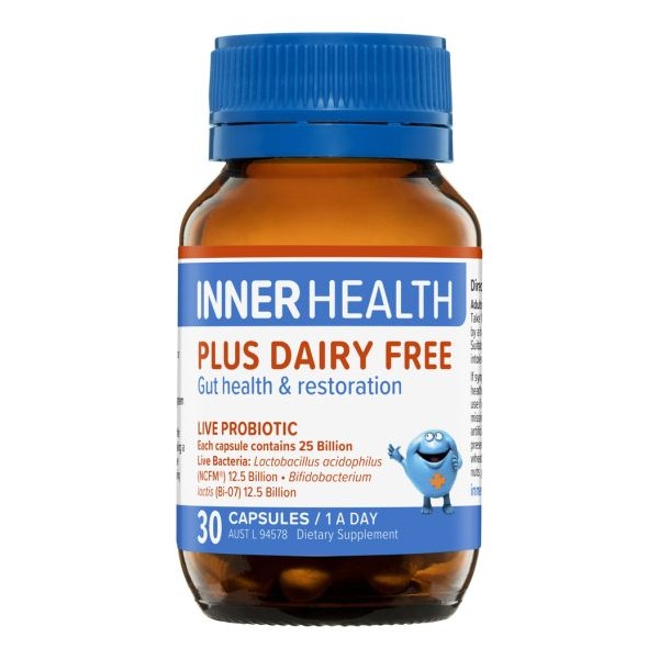 Inner Health Plus Dairy Free capsules aid in the maintenance of a normal healthy gastrointestinal system, and enhance levels of good gut bacteria.