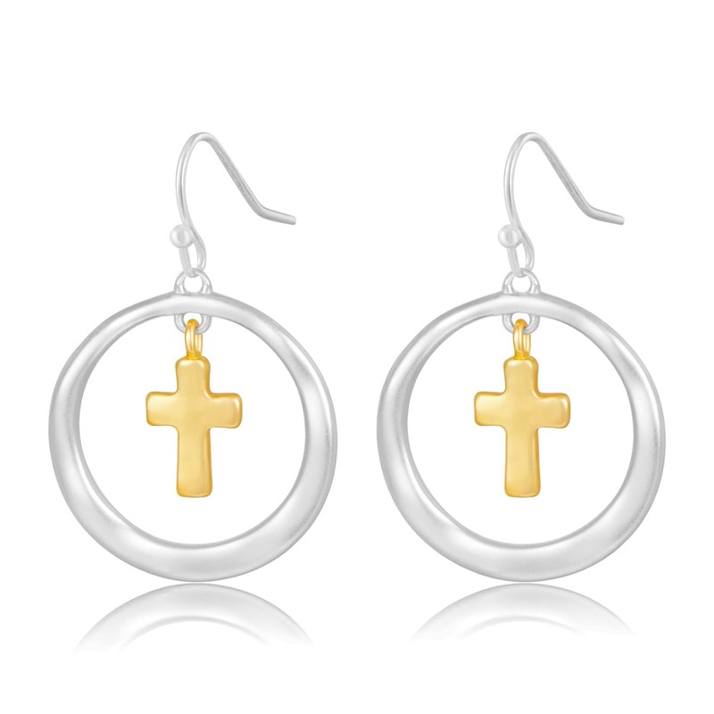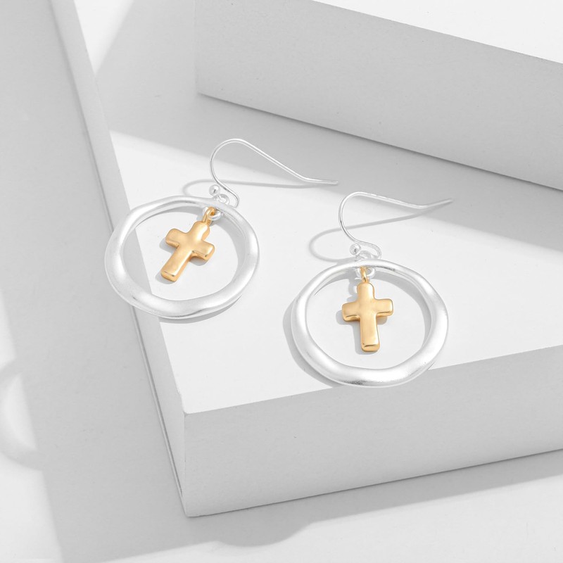 - Discover the elegance of our two tone earrings, featuring silver hammered circles paired with a gold hammered cross. These earrings blend modern sophistication with a touch of bohemian flair, making them a standout addition to any jewelry collection.