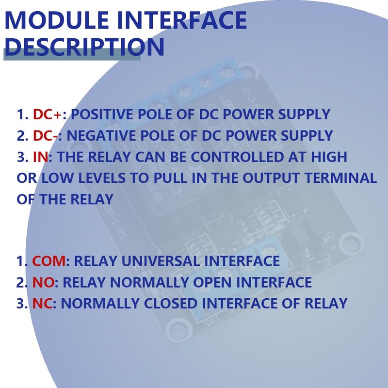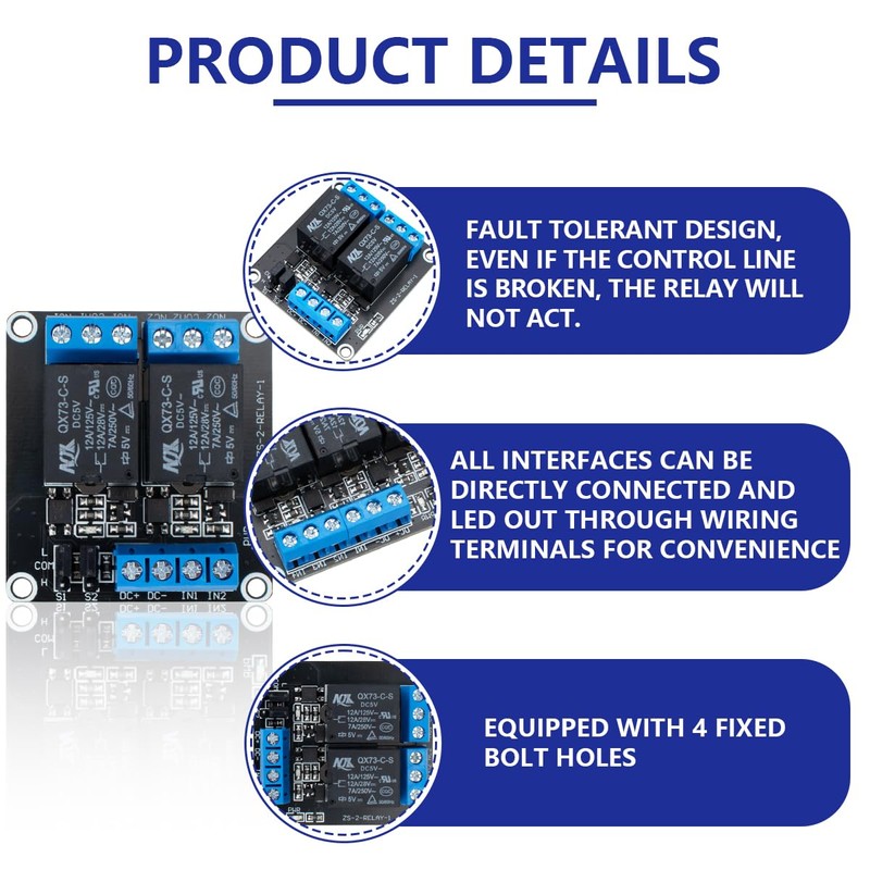 - Relay module designed with fault tolerant. Even if the control line breaks, the relay does not move; with optical coupling insulation, trigger more reliable and stable