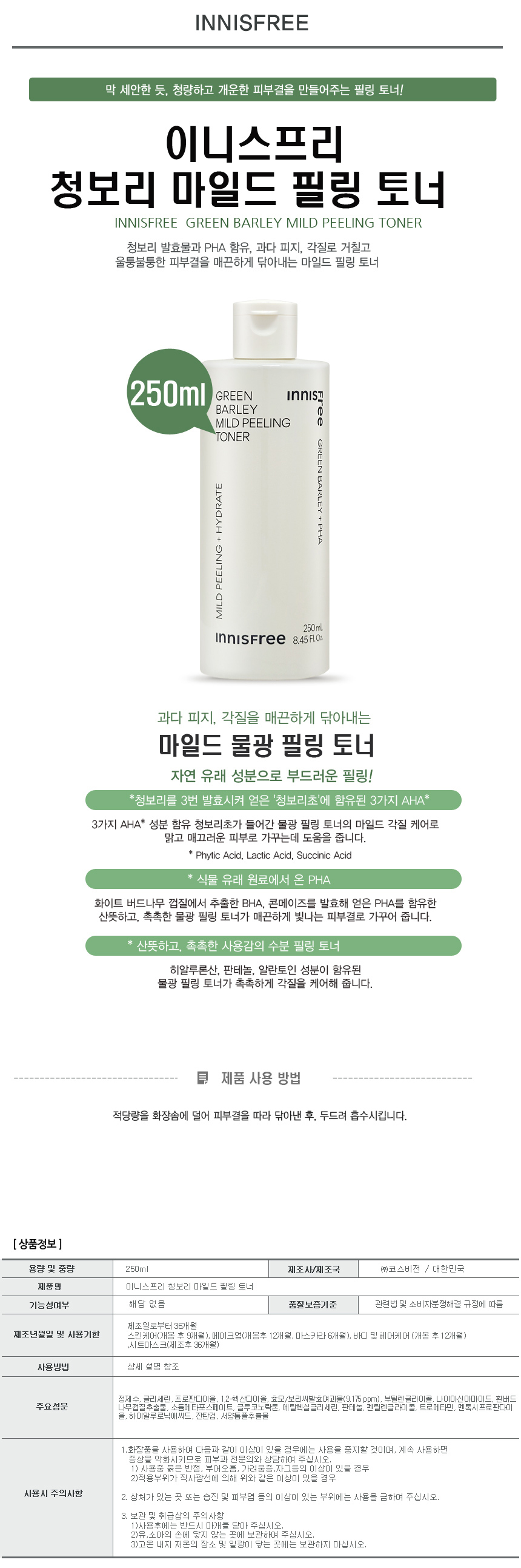 Innisfree Green Barley Mild Peeling Toner 250ml / 이니스프리 청보리 마일드 필링 토너 250ml