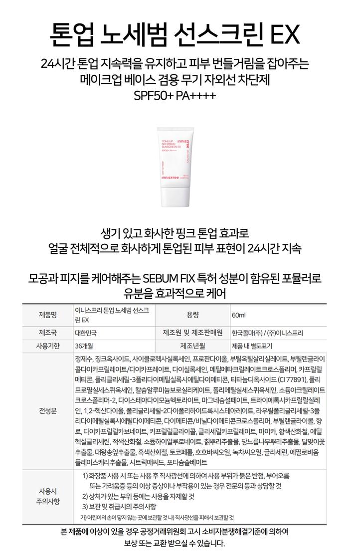 Innisfree Innisfree Tone Up No Sebum Sunscreen EX 60ml / 이니스프리 이니스프리 톤업 노세범 선스크린 EX 60ml