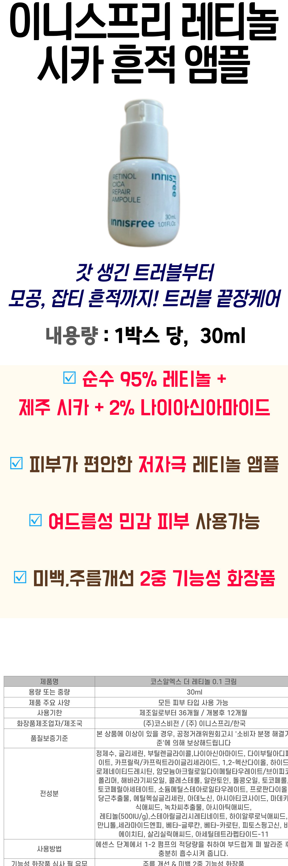 Innisfree Pure Retinol Cica Niacinamide Ampoule for skin texture improvement, spot removal, skin tone up, dead skin cells, pores, sebum removal / 피부결 개선 순수 레티놀 시카 나이아신아마이드 앰플 이니스프리 흔적 잡티 피부 톤업 각질 모공 피지 여