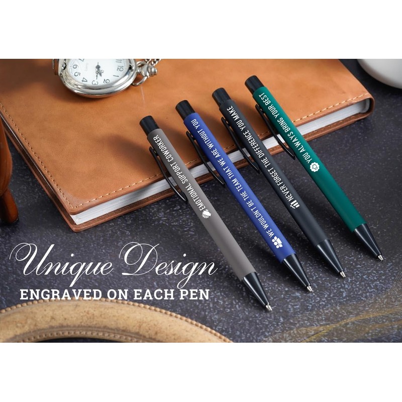 - This gift box comes with four ballpoint pens, each featuring a unique inscription, making it a highly personalized gift. The four inscriptions are labeled as 'Emotional Support Coworker', 'We wouldn't be the team that we are without you', 'Never forget the Difference you make', and 'You always bring your best'.