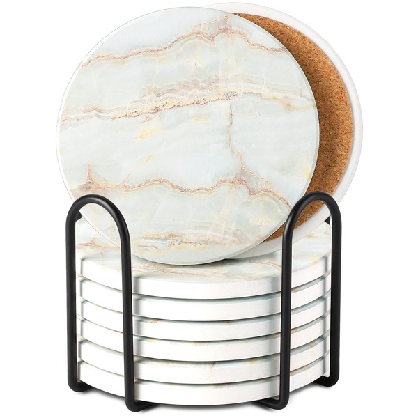 - Marble Pattern Coaster Set: Package includes 8 pieces of absorbent marble pattern coasters and a durable metal holder to keep the coaster neat while they are out of use. Perfect gift for housewarming, birthday, holiday, etc.