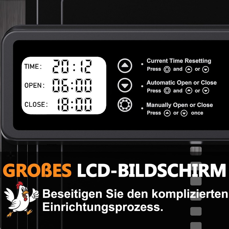 - ❸【EINFACHE KONFIGURATION】Die automatische Hühnertür mit integriertem LCD-Bildschirm ermöglicht eine einfache Einstellung und Justierung der Öffnungs- und Schließzeiten. Dies bietet Komfort und Genauigkeit in der Handhabung und eliminiert jegliche Unsicherheiten.