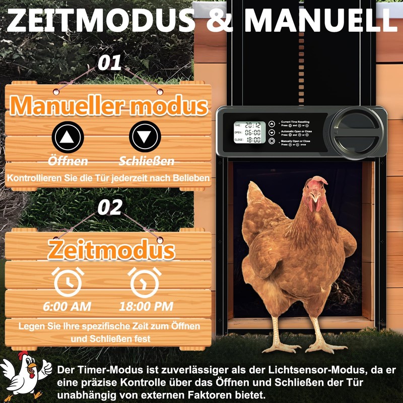 - ❷【PRÄZISER ZEITMODUS】Unser Produkt nutzt einen präzisen Timer-Modus für zuverlässigen Betrieb bei jedem Wetter, ohne unbeständige Lichtsensoren, die durch wechselnde Lichtverhältnisse zu zufälligem Öffnen oder Schließen der Tür führen können. So garantieren wir einfache und effektive Bedienung.