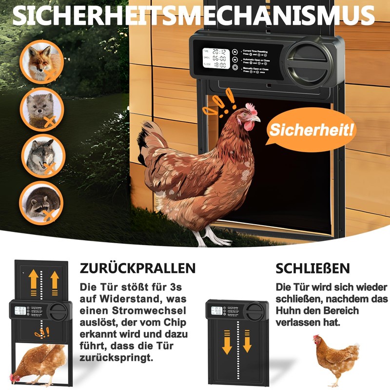 - ❹【SICHERHEITSMECHANISMUS】Ein integrierter Sensor erfasst, ob sich ein Hindernis im Bereich der Tür befindet und unterbricht umgehend den Schließvorgang, um Verletzungen der Hühner zu verhindern und ihre Sicherheit zu gewährleisten.