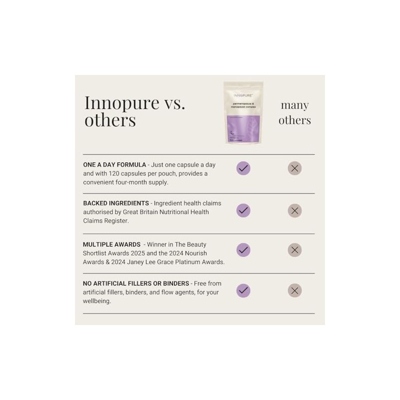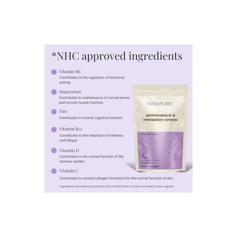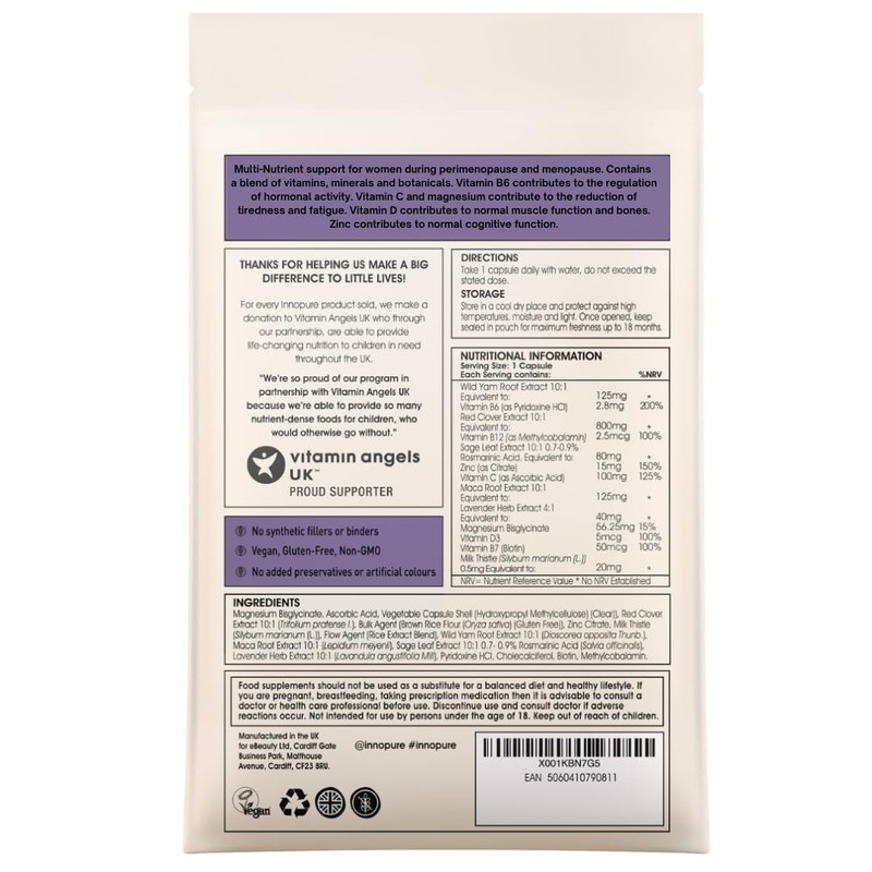 - Carefully Selected Blend of Vitamins, Minerals & Botanicals: Innopure Perimenopause & Menopause Complex ingredients include; Red Clover, Wild Yam, Sage Leaf, Maca, and Lavender, along with vitamins B6, B12, C, D3, and Biotin, plus minerals Magnesium and Zinc - designed to support your well-being during perimenopause and menopause.