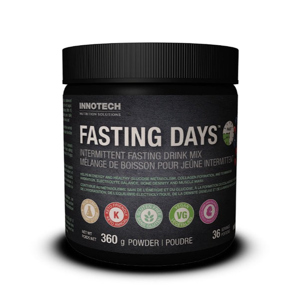 Fasting Days™ is formulated by Reginald Friesen M.D. and Innotech Nutrition to help support Intermittent Fasting with a balanced nutrient fortified powder mix that is mixed into water. It is low in calories, non-GMO, non-dairy and free of sugar, gluten, MSG, artificial sweeteners, artificial flavors and colors. With 10 grams of amino acids, 13 vitamins and minerals including your daily electrolyte requirement, this product helps support the body’s natural ability during your fasting hours. Naturally sweetened.