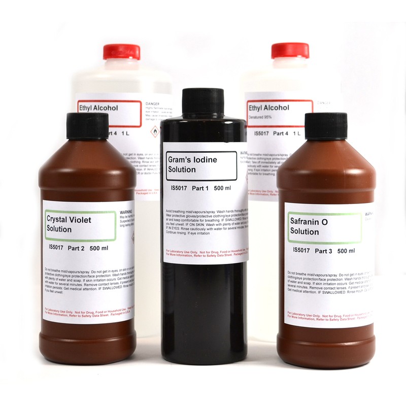- Kit includes dilute lugols, crystal violet stain, safranin 0 (1% aqueous), Ethanol