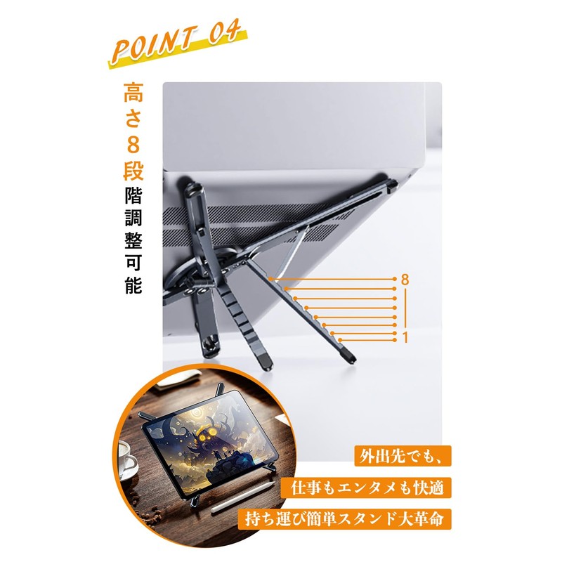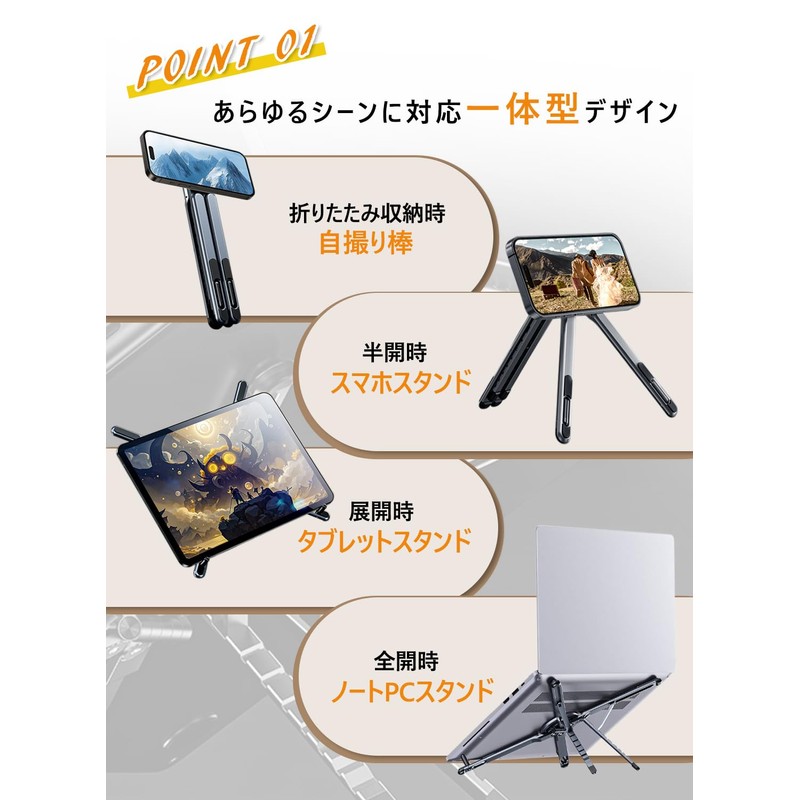 - Innovative 4-in-1 Design: This stand combines the functions of a laptop stand, tablet stand, smartphone stand, and selfie stick, allowing you to use your device comfortably in any situation