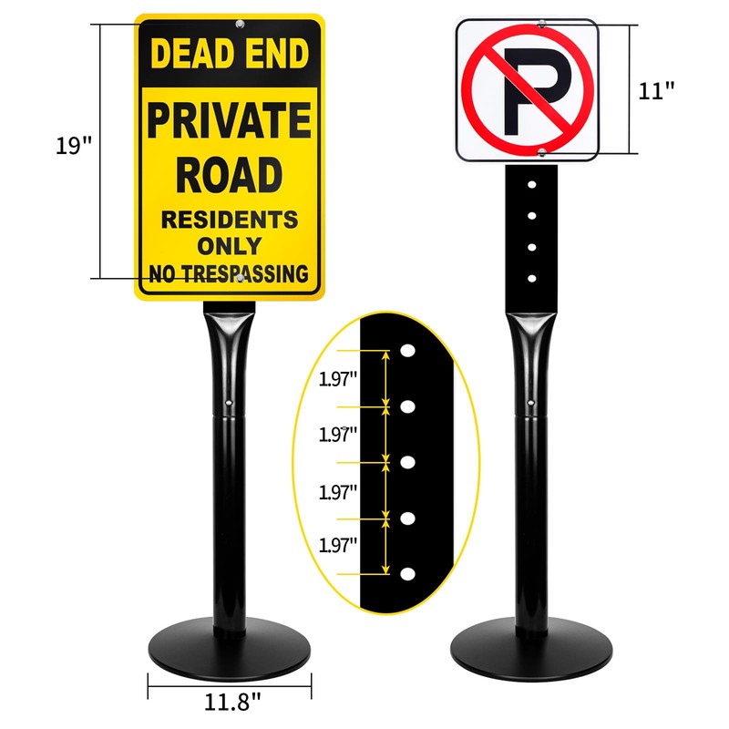 - SUITABLE FOR A VARIETY OF STANDARD SIGNS: 6 mounting holes are reserved for the column, the minimum installation distance is 11", and the maximum installation distance is 19". The mark must not exceed 19" to avoid affecting stability.