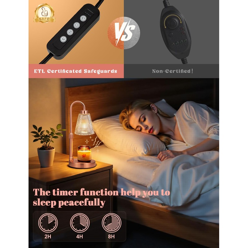 - 【Dimmable Candle Warmer Lamp with Timer】Our controller features four brightness settings and a timer function, and comes with an ETL-certified switch for added peace of mind. You can adjust the brightness to control the speed at which the fragrance is released, tailoring it to your personal preferences. The timer function means you can leave home without worrying about forgetting to turn the candle light off