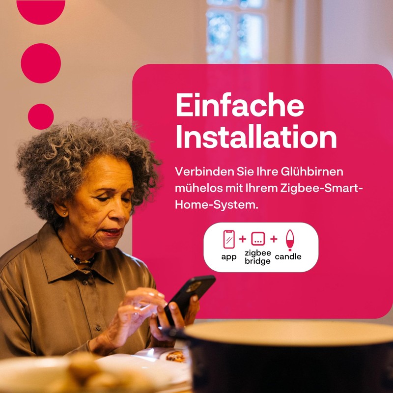 - Einfache Installation: Ersetzen Sie einfach die vorhandene Glühbirne in Ihren E14-Leuchten und verbinden Sie die neue Glühbirne über Ihre intelligente Beleuchtungs-App mit Ihrem intelligenten Beleuchtungssystem.