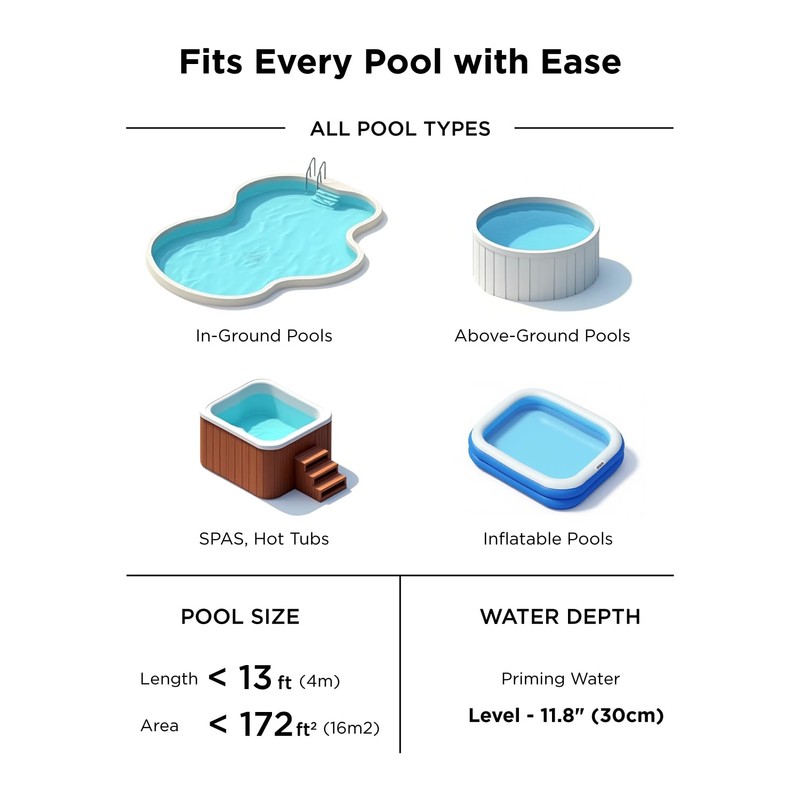 - [Adapts to Any Pool Type] This pool vacuum features a dual-mode brush head and vacuum port, making it ideal for cleaning both shallow steps and large debris. With a built-in extendable pole, you can easily clean every corner within a 78” radius without bending or repositioning. Perfect pool vacuum for above-ground pools and inground pools.
