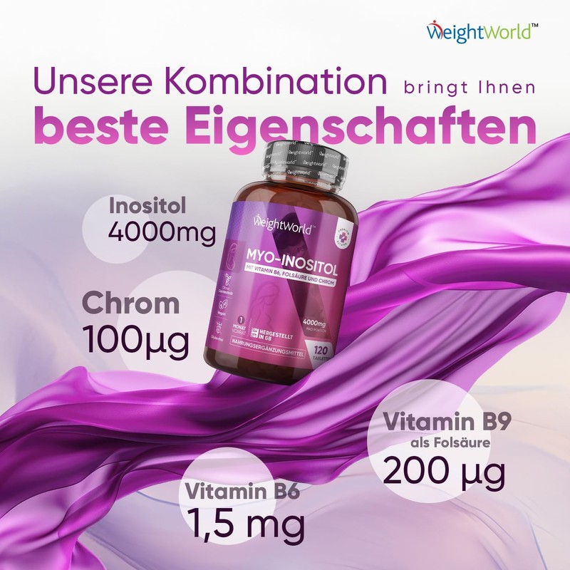 - WeightWorld Inositol tablets - We offer you the perfect combination you need for your general well-being. Our tablets contain 4000 mg inositol (myo-inositol), 1.5 mg vitamin B6 (as pyridoxine HCL), 200 μg vitamin B9 (as folic acid), 100 μg chrome (as chrome picolinate). Each bottle contains 120 tablets, which is enough for 1 month for a healthy lifestyle. Take 4 tablets daily with a glass of water, preferably with a meal.