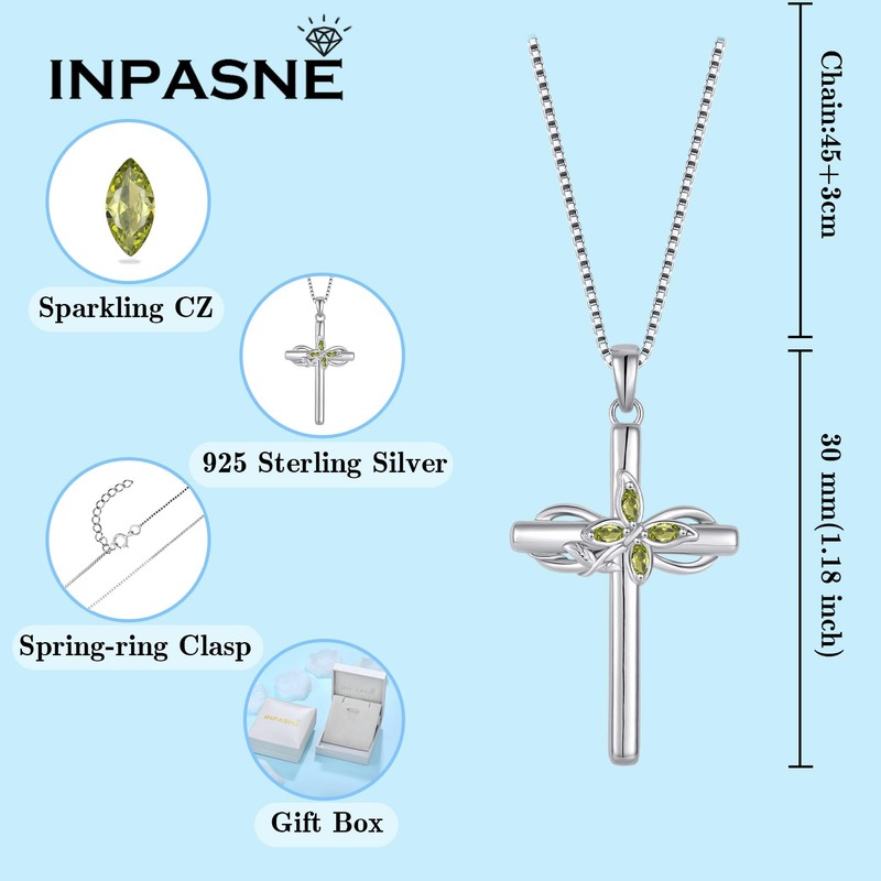 Inpasne Cross Necklace for Women 925 Sterling Silver Infinity Butterfly Cross Pendant Peridot August Birthstone Jewelry Crucifix Religious Gifts for Her