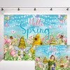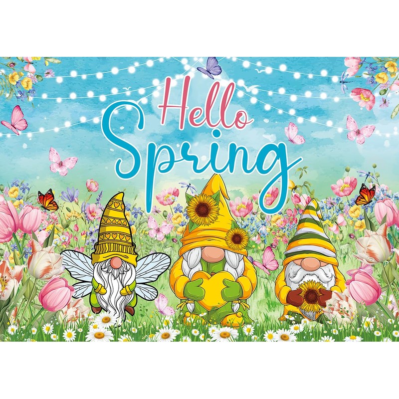 INRUI Hello Spring Photography Background Easter Garden Decorations Banner Spring Garden Gnomes Butterfly Blooming Flower Holiday Party Photo Backdrop (7x5FT)