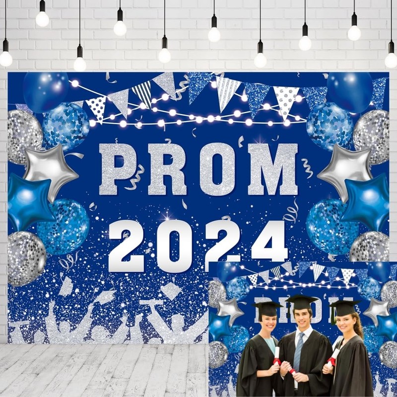 INRUI Prom 2024 Photography Background Blue and Silvery 2024 Prom Night Banner Glitter Balloons Flags Graduation Prom Party Decorations Backdrop (8x6FT)