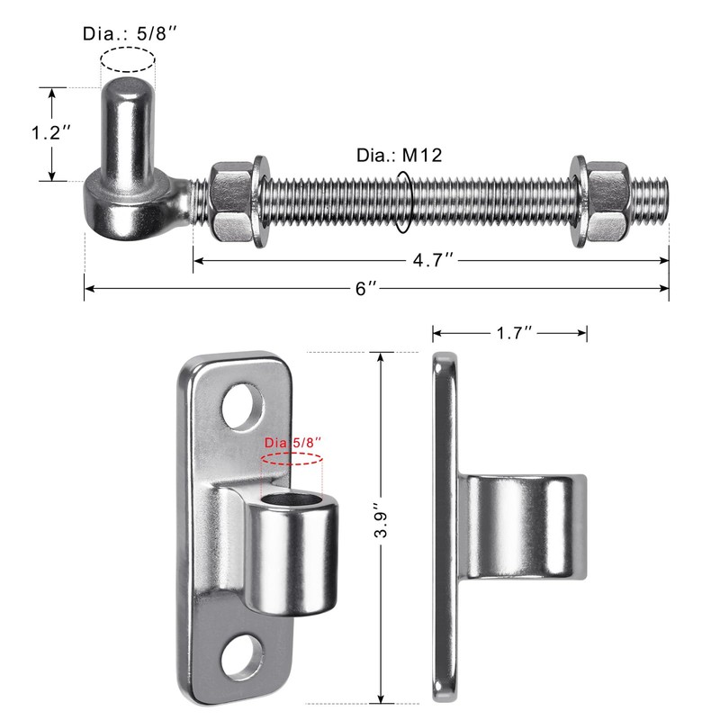 - Size: The overall length of the J-bolt is 6'' with 5/8'' pin hinge, the threaded shaft length is 4.7", come with nuts and washers for installation; the size of gate hinge is 3.9''(L) x1. 2''(W) with hole DIA 5/8''.