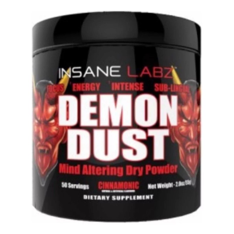 INSANE LABZ DEMON DUST Demon Dust es un producto tan creativo como no hay otro Demon Dust es un polvo seco promotor de energía, significando que no necesitas agua para energizarte. Resultados RapidosTe podrás preguntar ¿En cuánto tiempo? Demon Dust trabaja tan rápidamente que es genial para cuando vas de camino o sales a trabajar Como se toma??Solo toma una cucharada y deposítalo debajo de tu lengua, déjalo disolverse por 15 segundos y entonces come el residuo de polvo con sabor canela que quede ahí Demon Dust es una nueva manera de aumentar tu energía o usar un pre work, como sea el caso. NO SE NECESITARÁS JAMÁS UN SHAKER! Uso recomendado: Como suplemento dietético y en dieta adulta, tomar 1 servicio 30 minutos antes del ejercicio . Preferiblemente consumir con el estómago vácio y consumir con abundante agua. Nunca exceder 1 servicio al día. Información nutricional por servicioTamaño servicio: 1 servicio 1.1grms – 50 servicios Calorias 0 DEMON DUST BLEND 770mg Beta Alania, Cafeina Anhydrida,higemina hcl,bitrato de colina,hodina hcl Otros ingredientes: Natural And Artificial Flavor, Citric Acid, Malic Acid, Calcium Silicate, Silicon Dioxide, Sucralose, Acesulfame Potassium (Ace-K), Color FD&C Yellow #5