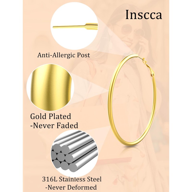 Inscca Silver Earrings for Women Hoop Earrings Gold/Rose Gold/Black 2 mm Thin Diameter Small 30/40 mm Medium 50/60 mm Large 70/80 mm Gifts, Stainless Steel