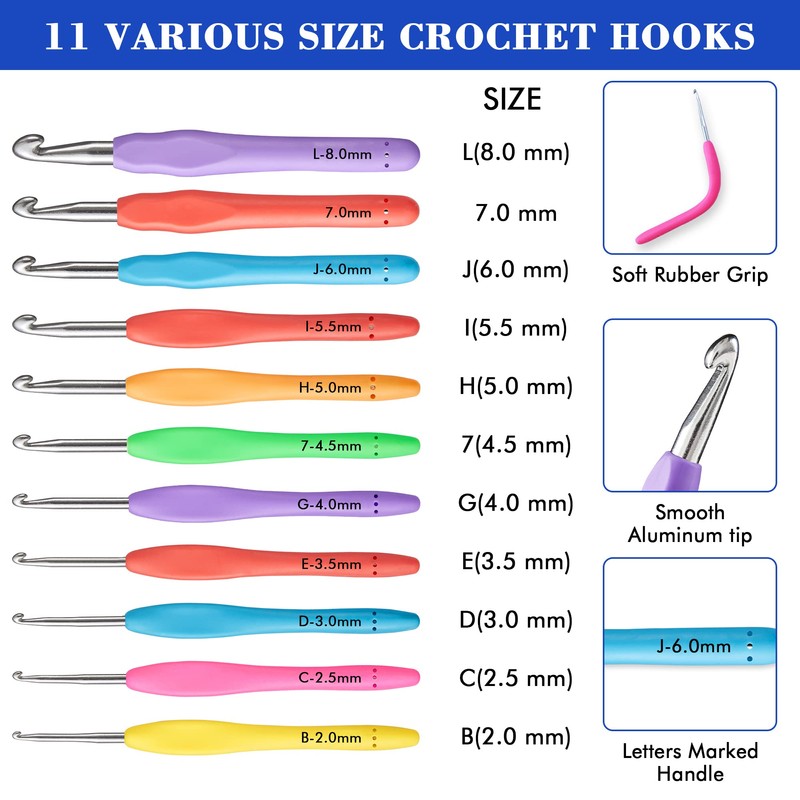 - 11 Sizes Rubber Handle Hooks & 8 Sizes Plastic Handle Hooks: You get 11 ergonomic soft rubber handle hooks, size ranges: B(2mm), C(2.5mm), D(3.0mm), E(3.5mm), G(4.0mm), 7(4.5mm), H(5.0mm), I(5.5mm), J(6.0mm), 7.0mm, L(8.0mm). 8 Sizes Plastic Handle Hooks, size ranges: 0.6mm, 0.75mm, 0.9mm, 1.1mm, 1.25mm, 1.5mm, 1.6mm, 1.75mm.