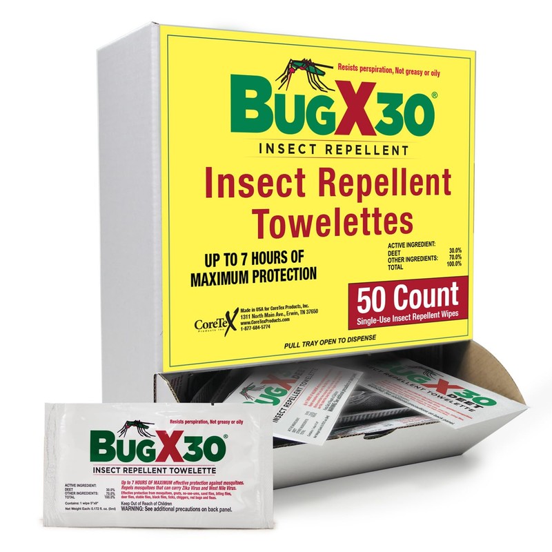 CoreTex Bug X 30 Mosquito, Tick, & Insect Repellent Wipes with 30% DEET - Pack of 50 Single-Use Bug Repellent Wipes for Up to 7 Hours of Reliable Protection Against 12 Types of Biting Insects
