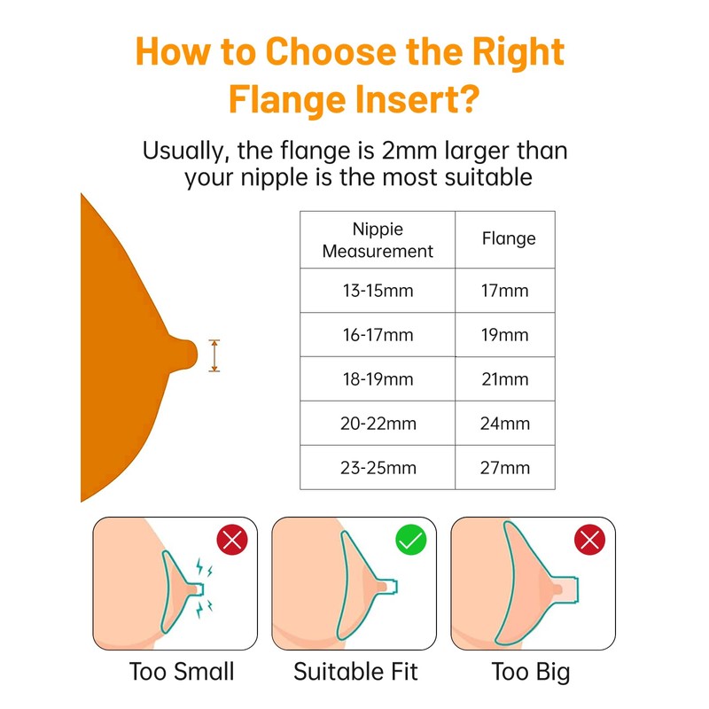 • Cómo elegir el inserto de brida correcto: el tamaño adecuado de la brida es importante para un bombeo cómodo y eficiente. Algunas madres experimentan hinchazón del pezón, hormigueo o expresan poca leche materna al bombear. Esto puede deberse al tamaño de brida inadecuado. Por lo general, la brida es 0.079 in más grande que tu boquilla es la más adecuada