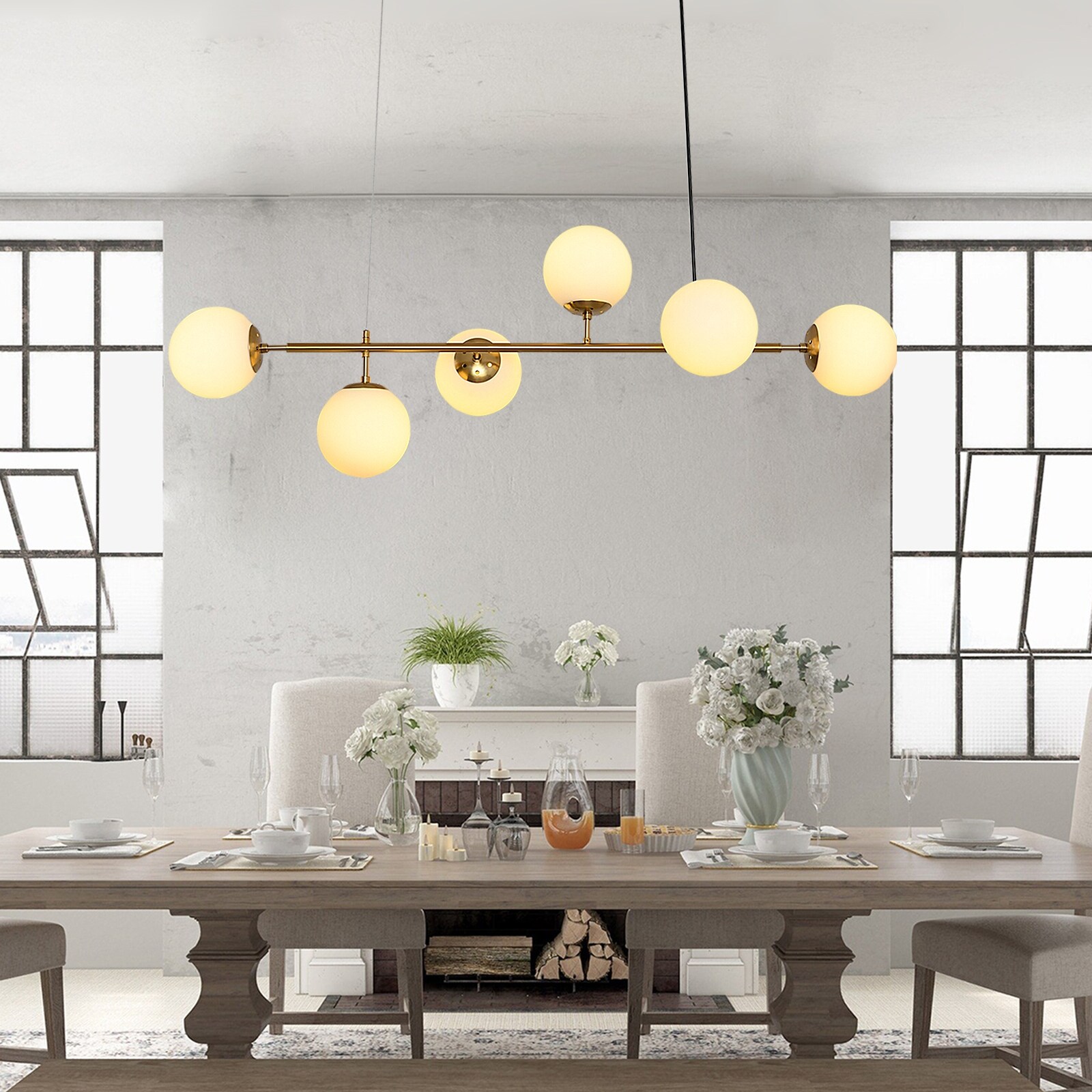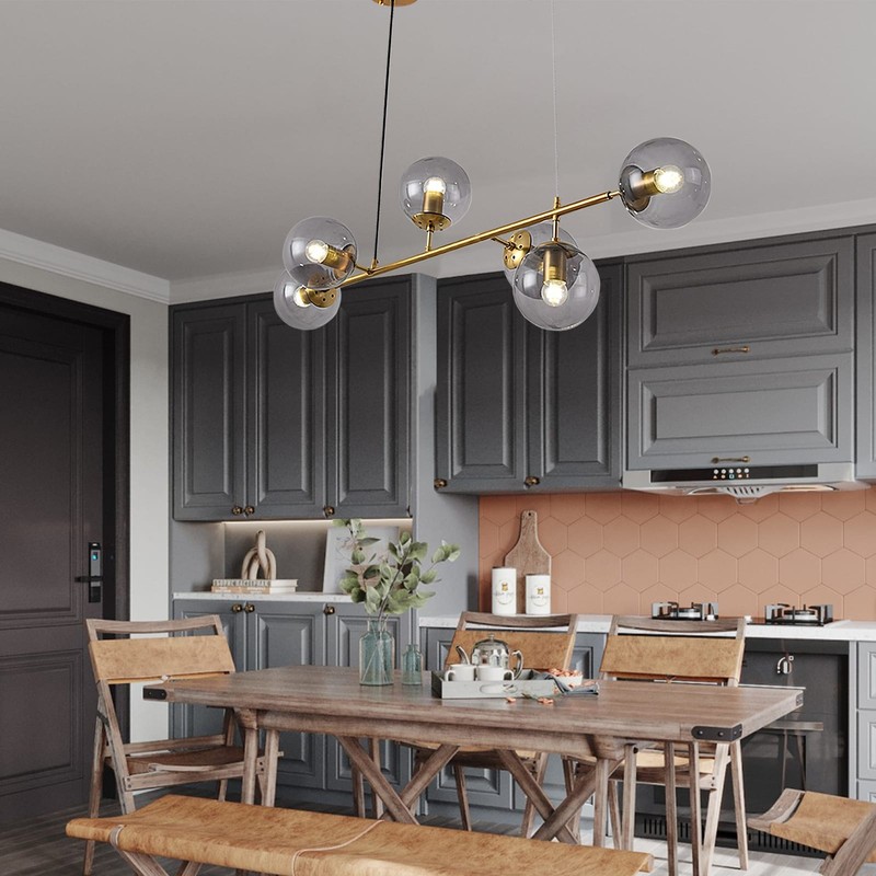 Elevate your space with this exquisite Modern 6 Light Chandelier Light Fixture. The Mid-Century Gold finish and Frosted Glass Globes create a contemporary look that will illuminate any room in your home.