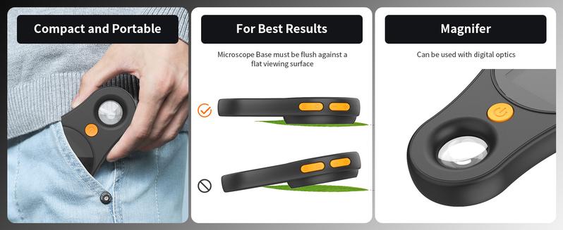 [Easy to operate] This pocket scope is designed to be user-friendly. Unfixed magnification, you can adjust the settings as needed. Simply turn on the mini scope, position the illuminated magnifier about 0.3 inches from the object, and you'll get a clear, magnified image! It's easy for both children and adults to use. A handy mini tool.