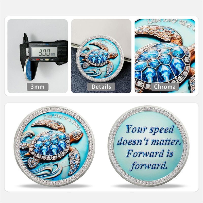Inspirational Challenge Coin One Day at a Time Motivational Design with Quote (Blue Crystal Turtle)