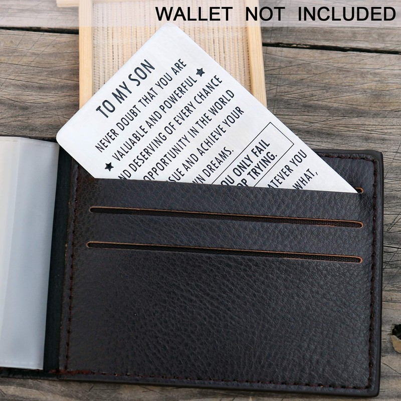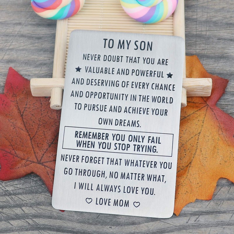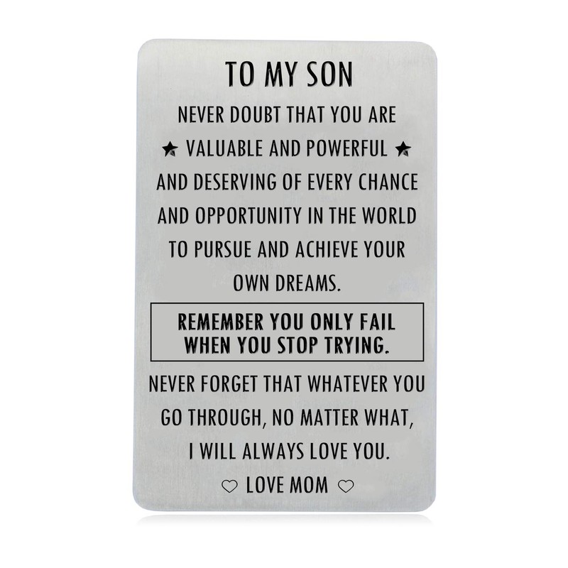 - MAKES A INSPIRATIONAL GIFTS: Keep encouraging your son with a stainless steel wallet insert card. And tell your son that no matter what happens, mom will always love you. Always remember that YOU ONLY FAIL WHEN YOU STOP TRYING. Perfect for Graduation Gifts, Birthday Gifts, Wedding Day Gifts, Christmas Gifts, Deployment Gifts, Thanksgiving Day Gifts and more.