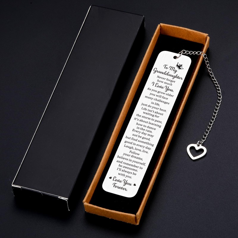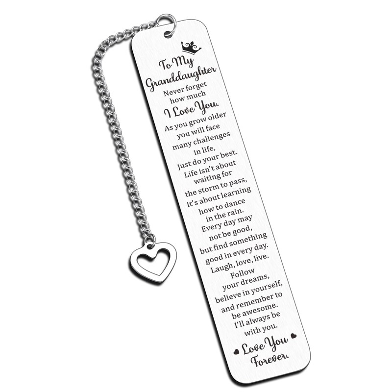 - Sentimental & Exquisite Granddaughter Gifts - This motivational bookmark is made of scratches resistant stainless steel, very sturdy and firm, not easy to bend or rust.The surface of it is finely polished without any blurs.And the cheerful sentences on the bookmark are carefully selected and beautifully engraved.Plus with appropriate size(5.12 x 1.02 x 0.02 inch) makes it portable for your granddaughter to carry around, bring her every day encouragement and support from you.