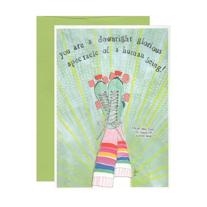 Spread joy and encouragement with this charming retro-inspired greeting card featuring a whimsical rollerskate design. The card showcases mint green roller skates adorned with classic laces and vibrant pink wheels, set against a radiant sunburst background. The colorful rainbow striped socks add a playful touch to this uplifting design. The heartwarming message "You are a downright glorious spectacle of a human being!" makes this card perfect for celebrating friendships, achievements, or simply reminding someone special how amazing they are. The smaller text "I'm so glad I get to watch you do your thing" adds an extra personal touch. This delightful card comes complete with a matching envelope, ready to brighten someone's day. The artistic illustration combines nostalgic roller derby vibes with modern encouragement, making it an ideal choice for friends, family, or anyone who needs a boost of confidence.
