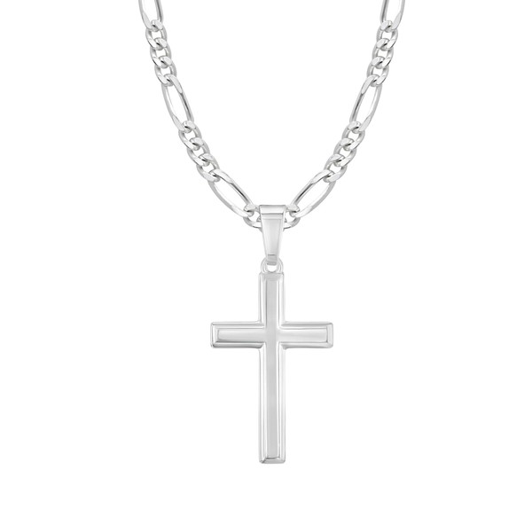 - Quality: The cross pendant is made from solid Sterling Silver 925, and is the perfect size at 1.5 inches X 0.75 inches (38mm x 19mm ). The solid Sterling Silver, craftsman made, Figaro chain is of the highest quality and made last. Additionally, both the pendant and chain are lead free, nickel free and hypoallergenic - so they will not make your skin red or itch.