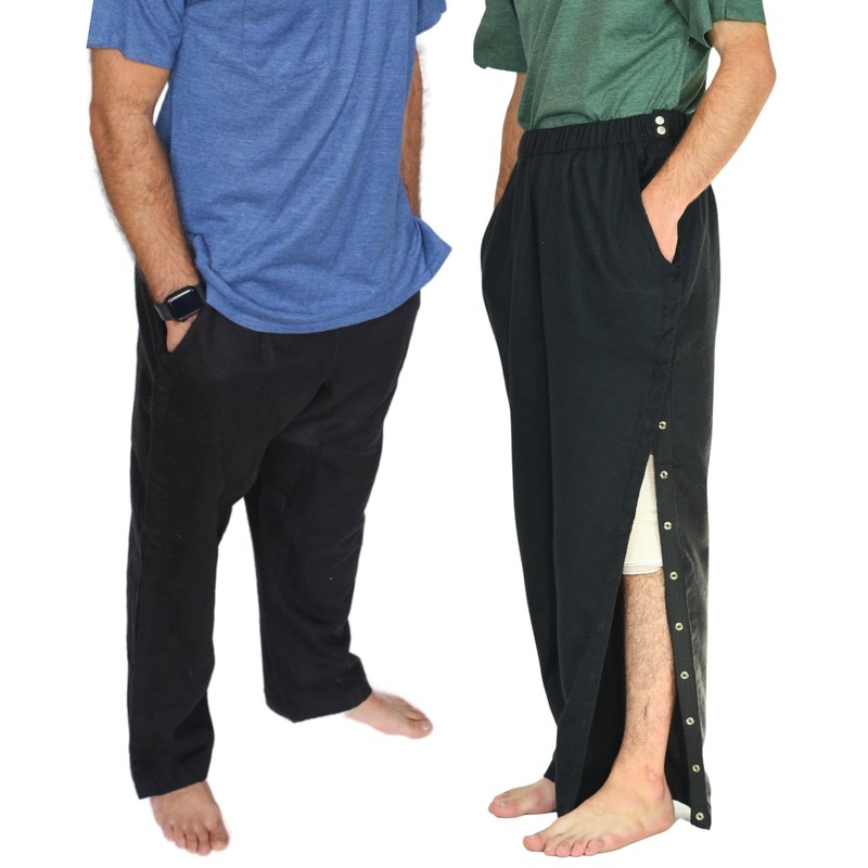 Inspired Comforts Men's/Unisex Tearaway Post Surgery Recovery Pajamas with Pockets | Hidden Easy Open Side Snaps | Adjustable Elastic | Soft Flannel | 2XL, Black