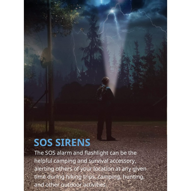 - Flashlight and SOS Sirens. The flashlight serves as a handy tool for camping and survival situations, providing a sense of security. It can also be a fun toy for children to use at night. Additionally, the SOS sirens can be utilized to signal your location to others in case of an emergency. This makes it ideal for activities such as hiking, camping, or hunting in harsh weather conditions.