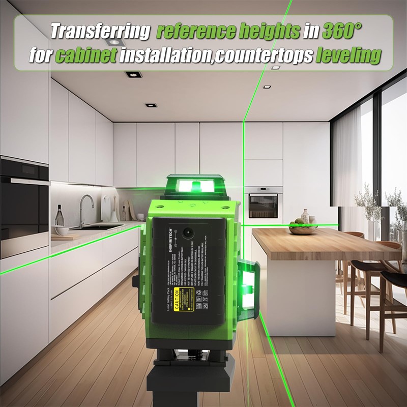 - 360 Degree Green Line Laser: INSPIRITECH 360 laser level features a 4x360 degree multifunctional green laser. It offers 360 degree alignment in leveling, squaring, and providing framing references with 2 horizontal and 2 vertical laser beams. Ideal for floor, wall, and ceiling construction, it enables easy height transfer, right - angle creation, or axis alignment. The independently switchable 16 line laser caters to layout work in interior construction, including wall and floor tiling, cabinet installation, countertop leveling, drywall track squaring, and drop ceiling grid installation.