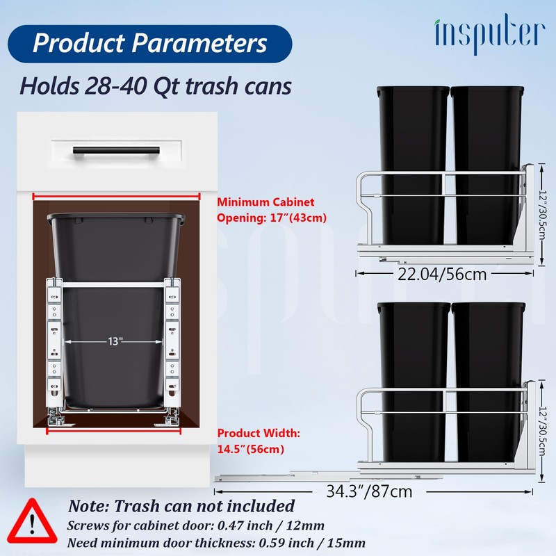 - Heavy Duty Mateial: Dual pull out trash cna are made of heavy duty structural steel with surface nano-painting technology, which is more resistant to corrosion and rust than normal painting technology, and lasts longer. The under cabient trash can pull out have enhanced weight capacity, which can withstand up to 120 pounds, no need to worry about bending the slides! Note: Not Included Can. The screws connecting the cabinet door are 12mm screws, please measure the thickness of the cabinet door first to avoid poking through the cabinet door!
