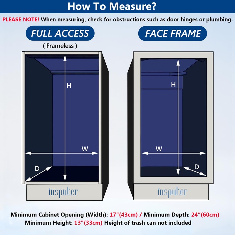 - Easy Installtion: No need to worry about installation difficulties! The under sink garbage can pull out has detailed instructions, installation videos and installation accessories, easy to understand! If you encounter installation problems you can contact us at any time, our customer service staff 24 hours online for you to solve any problem. Note: Please measure the cabinet to make sure the product fits the cabinet. Slide out trash can shelf size: 15"W x 22.4"D x 12"H, Fits minimum cabinet size: 17“W x 24"D(Should consider the height of the trash can.)