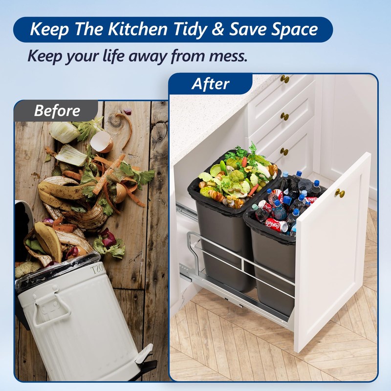 - Space Saving: Say goodbye to unsightly trash cans taking up valuable kitchen space! The under sink garbage can pull out fits perfectly underneath your cabinets, making it easy to hide recycling and trash storage in your cabinets, and preventing odors from escaping. The cabinet garbage can pull-outs are great for storage and can be used in sinks, pantries, bathrooms, laundry rooms, pet rooms, tool rooms, and many other places.