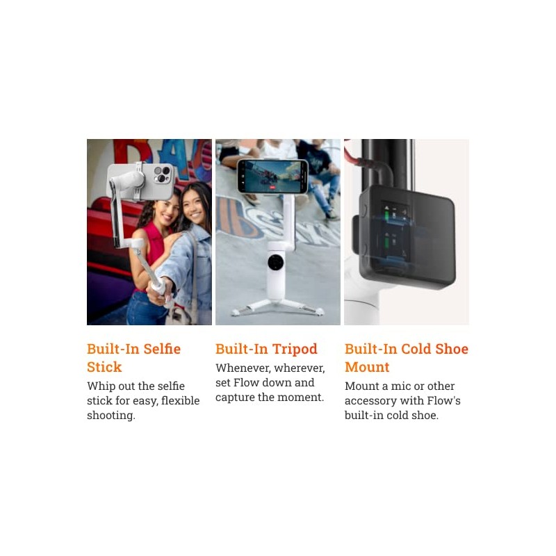 - Built-In Selfie Stick and Tripod: Whip out the selfie stick for easier, more flexible shooting. Get your whole crew in the shot or switch up the view in your clips with high and low shooting angles. Whenever, wherever, set Flow down and capture the moment. Flow is the only smartphone gimbal with a built-in tripod.