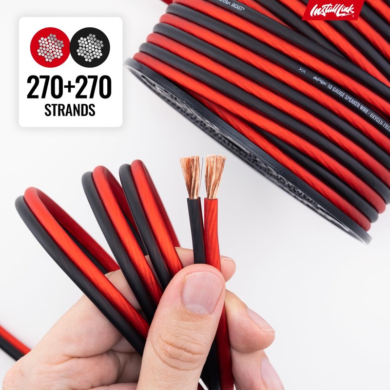 - PREMIUM OFC SPEAKER WIRE [ Frosted Red/Black | 50-feet (15.2m) | 10 Gauge ] - Featuring a double conductor, this stranded wire is constructed from high-grade oxygen-free copper. It is perfect for achieving outstanding audio performance, exceptional flexibility, easy stripping and great polarity identification.