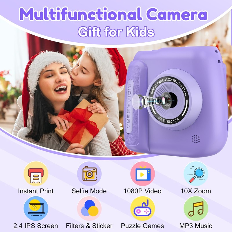 Instant Camera, Kids Camera Instant Print with 2.4 Inch Screen, Christmas Birthday Gifts for Girls Boys Age 3-12, Toddler Digital Print Toy for 3 4 5 6 7 8 9 10 Year Old,Front Rear Dual Selfie,Purple