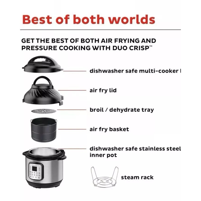 THE INSTANT POT THAT AIR FRIES: From the makers of the best-selling Duo series comes a pressure cooker and air fryer combo, with 2 convenient removable lids.