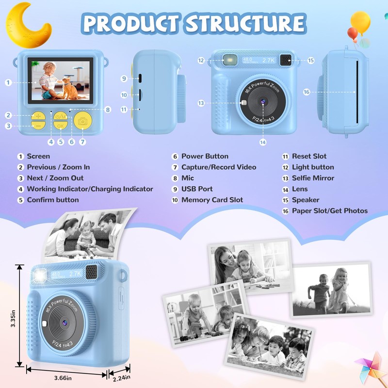 - 📷[Instant Print & Creative Fun]: This instant print camera for kids instantly prints black-and-white photos while saving vibrant color images on the SD card. With 15 scene filters and 16 stickers, children can print and decorate up to 240 photos using the 3 rolls of included paper, sparking endless creativity. Perfect as a kids camera and a creative gift to encourage artistic exploration.