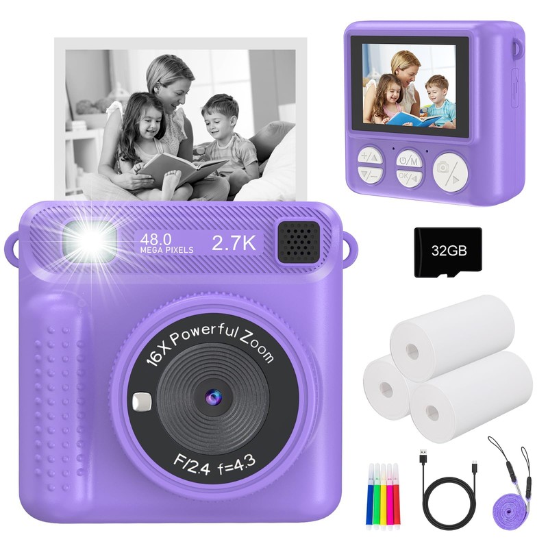 Instant Print Kids Camera - 1080P Selfie Digital Camera, Portable Travel Toy for Boys & Girls Age 3-12, Christmas Birthday Gifts (Purple)