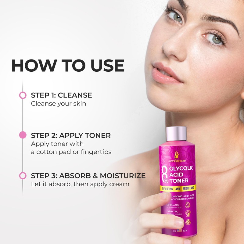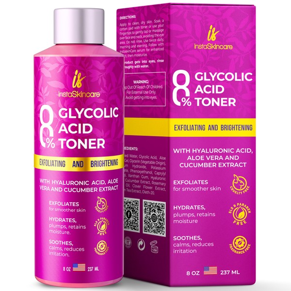 InstaSkincare Glycolic Acid 8% Toner for Face - Facial Toning Solution - Exfoliating Face Toner for Women & Men Made in USA